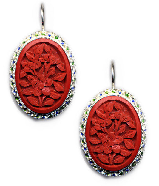 Flower Cinnabar Enamel Rim Hook Earrings