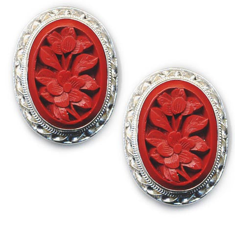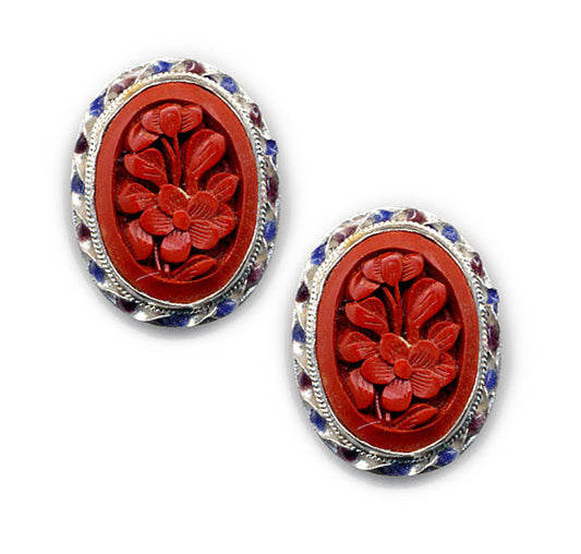 Flower Cinnabar Enamel Rim Clip On Earrings