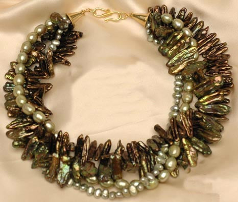 Beautifully made multi strand and multi shape fresh water green pearls. Finished with a vermeil S-clasp. 18"